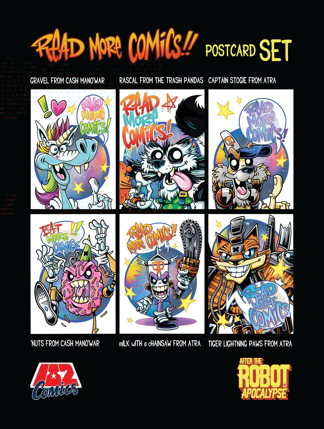 6 characters from my comic worlds feature on 6 postcards. All feature the text 'Read More Postcards'.